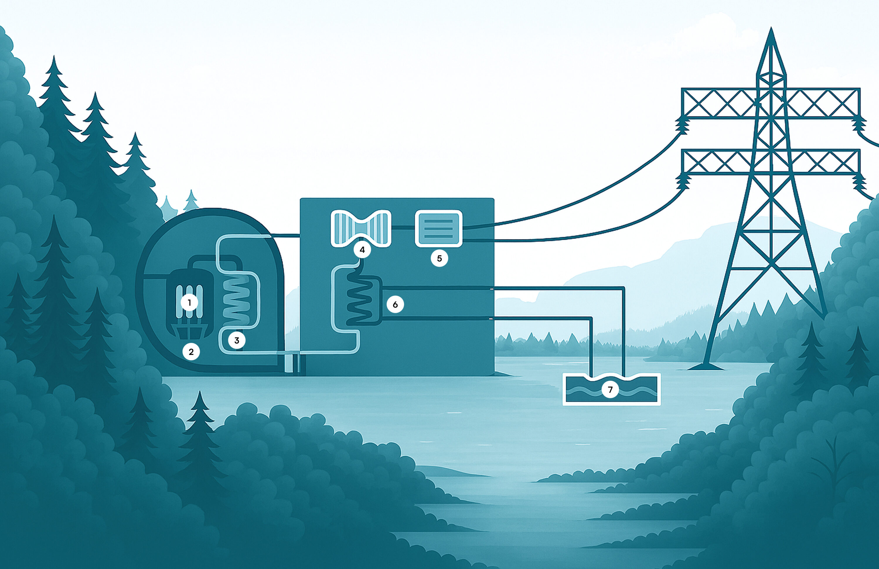 Een kerncentrale gebruikt de warmte die vrijkomt bij de splijting van splijtstof, zoals uranium, om elektriciteit op te wekken. Dit gaat als volgt: Binnen de centrale bevinden zich staven van uraniumoxide in een vat met water (1 en 2). Wanneer de uraniumkernen in deze staven splijten, komt er warmte vrij, waardoor het water heet wordt. Dit hete water stroomt naar een stoomgenerator (3), waar het zijn warmte afgeeft aan een tweede watercircuit dat stoom produceert. De stoom drijft een turbine aan (4), die een generator (5) aandrijft om elektriciteit te produceren. Na de turbine condenseert de stoom in een condensor (6) weer tot water, doordat hij warmte afgeeft aan koelwater uit het koelwatersysteem (7). Bij kerncentrales zijn er drie aparte, gesloten, circuits, zodat het water uit de reactor niet in de turbine of koelvoorzieningen komt. Daarmee blijft het primaire (reactor)circuit gescheiden en wordt verspreiding van radioactieve stoffen voorkomen. Alles bij elkaar leidt dit proces tot een veilige, stabiele en efficiënte productie van elektriciteit.